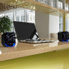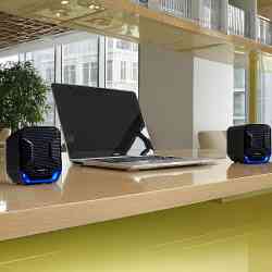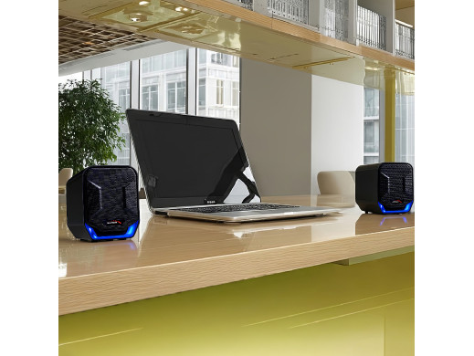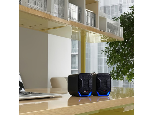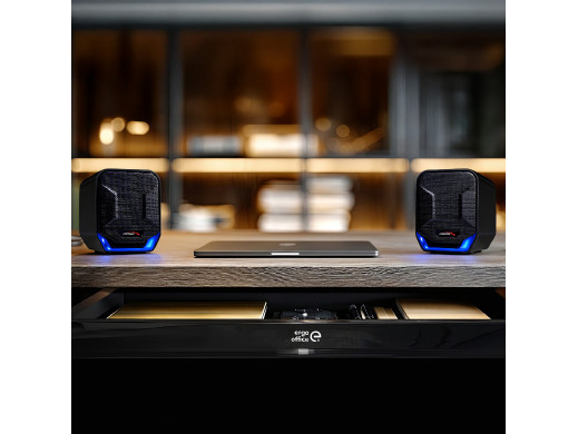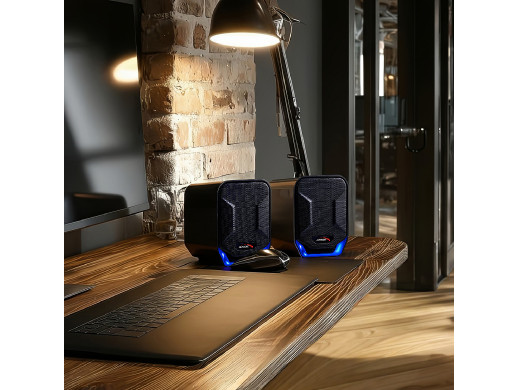 Nowoczesny wygląd sprawia, że doskonale komponują się na biurku z monitorami LED, LCD i innymi akcesoriami. Niebieskie podświetlenie LED nadaje charakteru głośnikom.