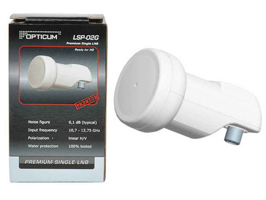 Konwerter LSP-02G OPTICUM jest wysokiej klasy markowym urządzeniem. Należy do czołówki na świecie pod względem parametrów i wykonania. Charakteryzując się małym współczynnikiem szumów fazowych 0,1dB. Konwerter Single umożliwia niezależne odbieranie sygnału z jednego satelity na 1 tunerze.