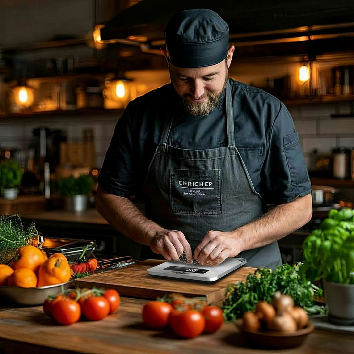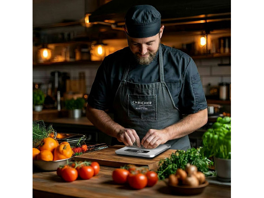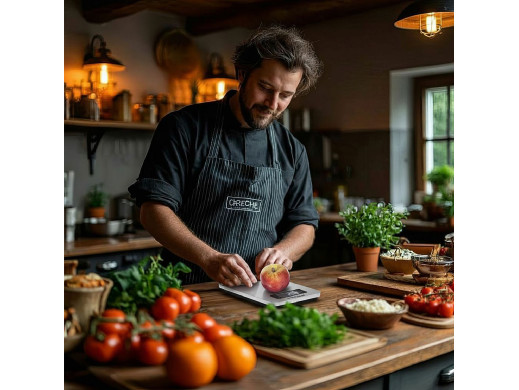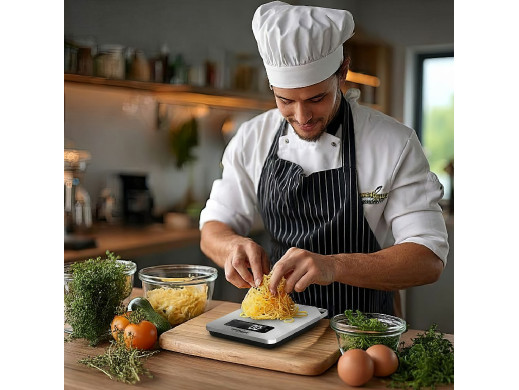 Wysokiej jakości nowoczesna waga kuchenna o kompaktowej konstrukcji. Niezwykle pomocna przy przygotowywaniu dań wymagających ściśle określonych proporcji produktów.