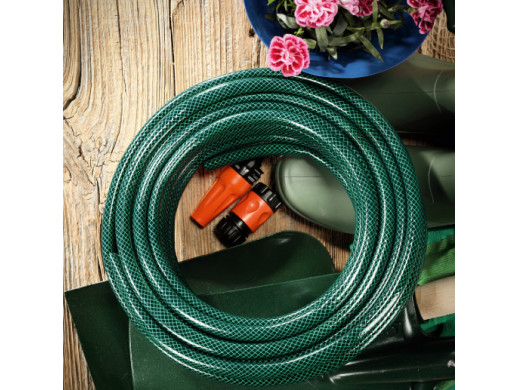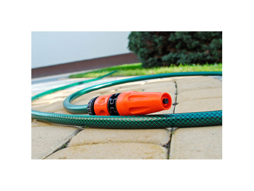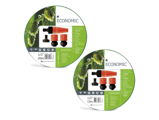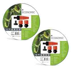 Zestaw ogrodowy Cellfast Economic, w skład którego wchodzą wąż 20m 1/2", zraszacz prosty, szybkozłącze stop, szybkozłącze przelot, przyłącze z gwintem wewnętrznym 1/2".