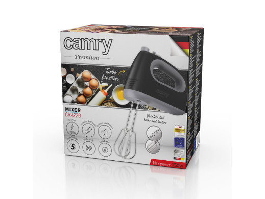 Poręczny mikser kuchenny o mocy 750 W. Niezbędny dla każdej osoby, która piecze ciasta i ciasteczka. Pozwala na wykorzystanie 5 różnych prędkości, w zależności od rodzaju przygotowywanej potrawy. Dzięki temu nadaje się zarówno do mieszania mąki z innymi składnikami, jak i do ubijania jajek. W razie potrzeby można też użyć funkcji Turbo.