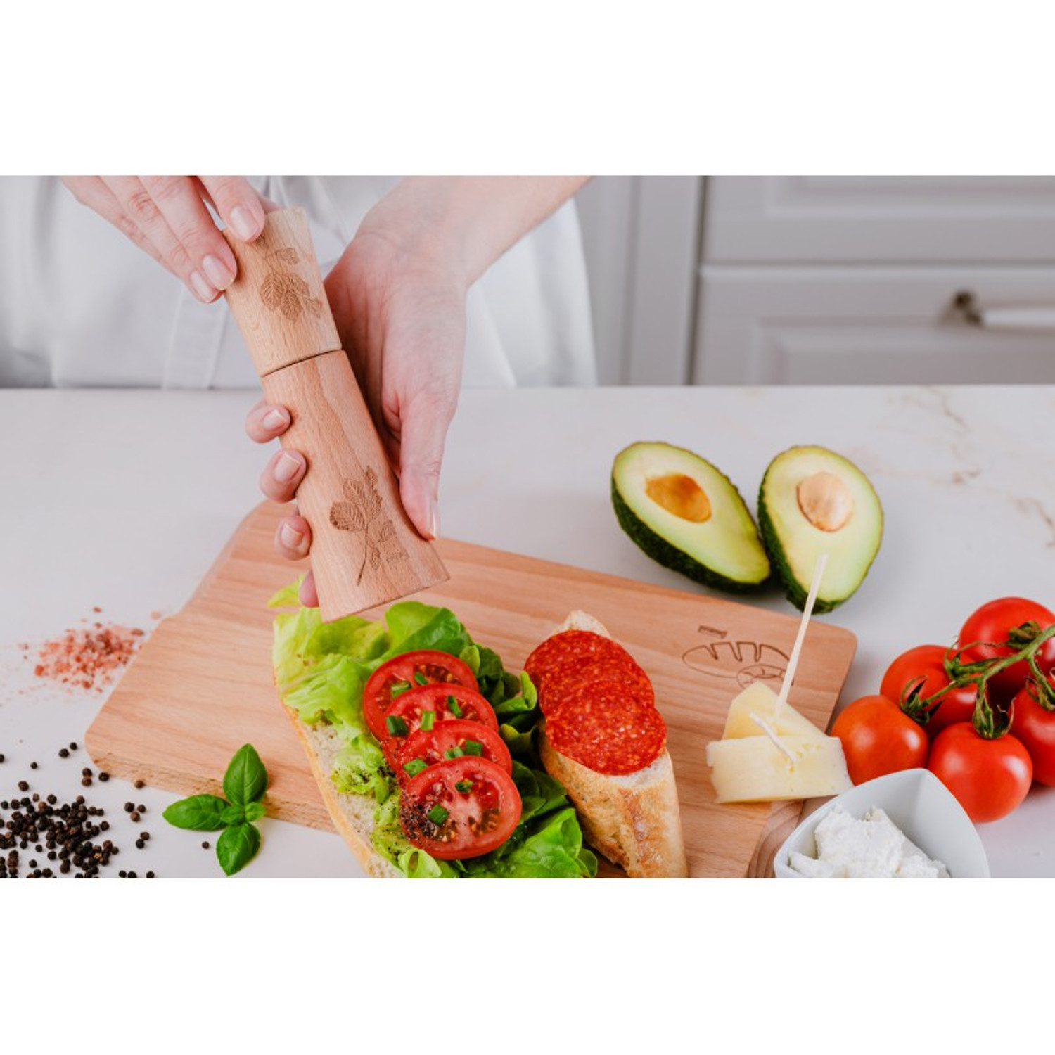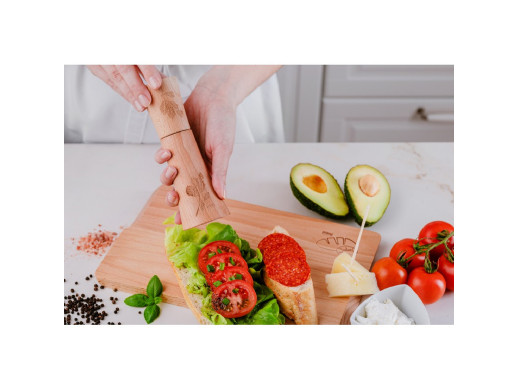 Dwustronna powierzchnia ułatwia organizację pracy: możesz przeznaczyć jedną stronę na pieczywo, a drugą na produkty wymagające wyraźnego rozdzielenia, takie jak mięso czy ryby. Na desce znajduje się trwałe oznakowanie (wypalany wzór), które pomaga szybko rozróżnić przeznaczenie stron, a jednocześnie stanowi unikatową, dekoracyjną cechę produktu. Buk, jako materiał naturalny, ma również właściwości sprzyjające higienie i utrzymaniu czystości, dlatego deska świetnie sprawdzi się w każdej kuchni – klasycznej i nowoczesnej.
