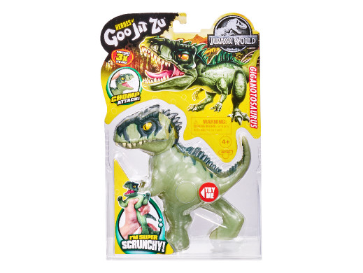 Goo Jit Zu Jurassic World to figurki dinozaurów stworzone specjalnie z myślą o dzieciach, które uwielbiają eksplorować świat i swoje otoczenie. Figurki można zgniatać, rozciągać, skręcać i odkształcać, a one zawsze wrócą do swojej pierwotnej postaci. Każdy dinozaur posiada żelowe wypełnienie z małymi niespodziankami w środku (kulki, czaszki, pióra), które w zabawie pobudzają dziecięce zmysły.