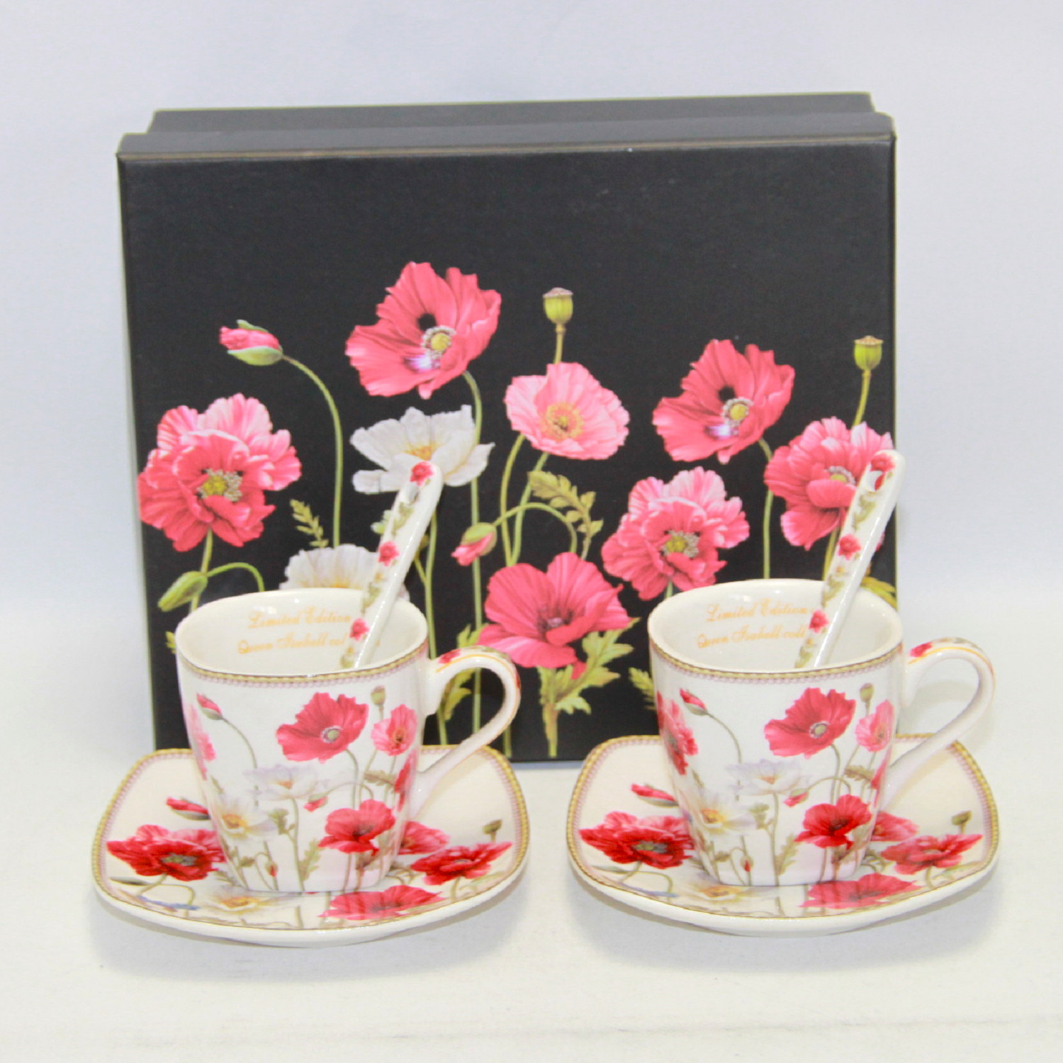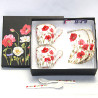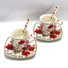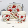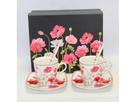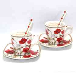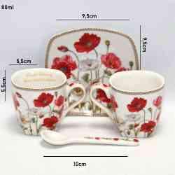Do wykończenia filiżanek użyto wzoru z makami, który nadaje całości ponadprzeciętnej elegancji i letniej aury dodatkowo dzięki zastosowaniu specjalnej techniki nakładania można być pewnym, że komplet zatrzyma swój blask na długo.