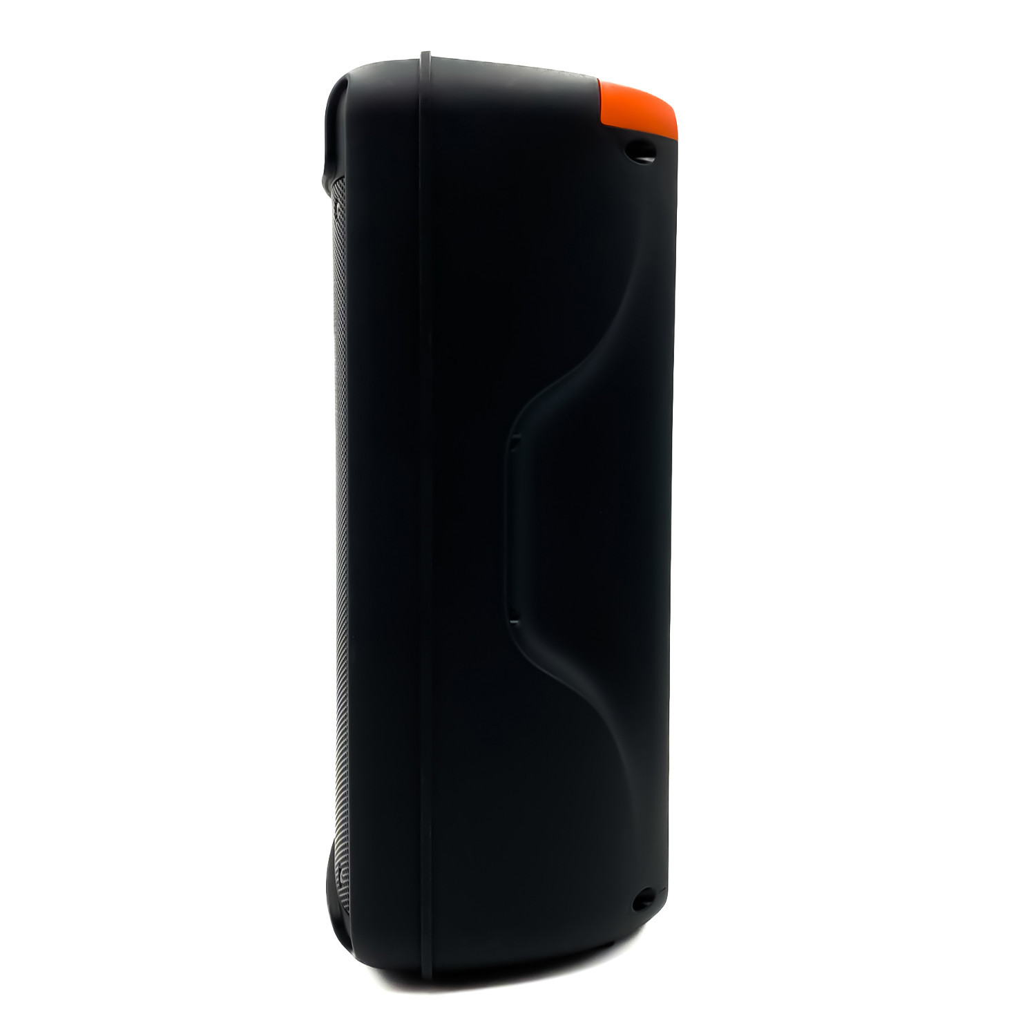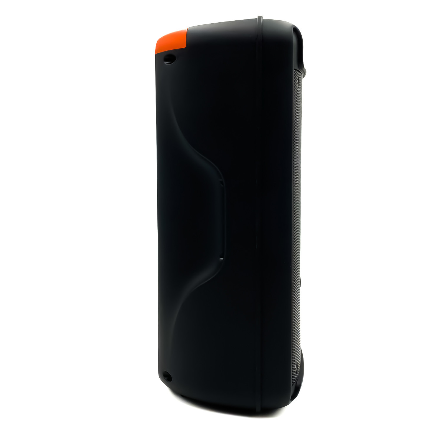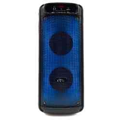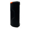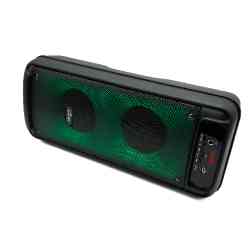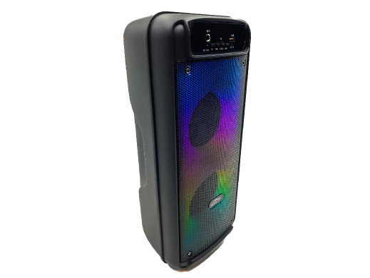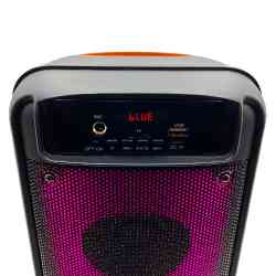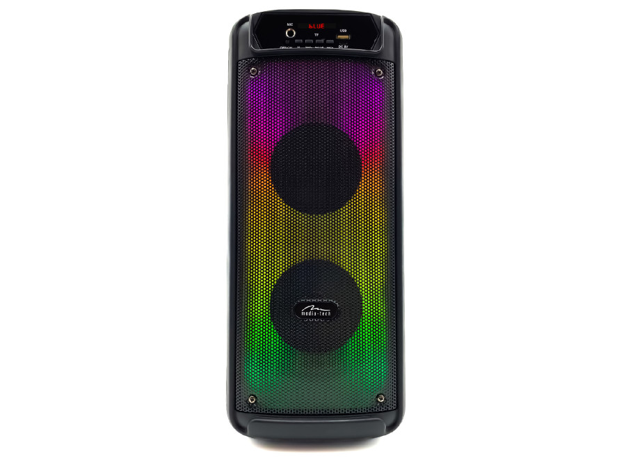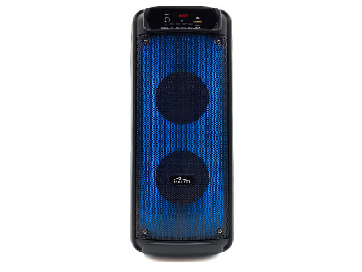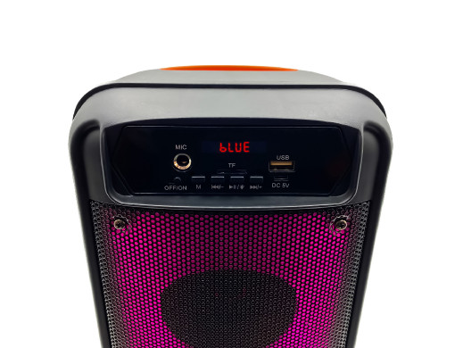 - Na panelu przednim znajdują się przyciski sterujące oraz dwa głośniki, ukryte za metalowym perforowanym grillem. Na przednim panelu znajdują się również: port USB, wejście AUX, wejście na mikrofon karaoke MIC jack 6,3, gniazdo na karty pamięci microSD oraz gniazdo microUSB służące do ładowania.