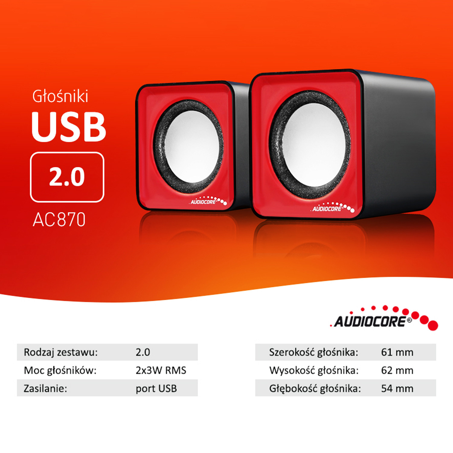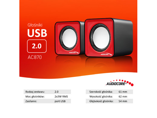 Zestaw zawiera- Głośniki komputerowe 6W USB Red&Black Audiocore AC870 R
