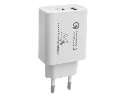 Ładowarka sieciowa Maclean PD USB-C 20W, wspiera wszystkie standardy szybkiego ładowania - Quick Charge 3.0, Samsung AFC, Huawei FCP oraz Apple 2.4A. Do tego posiada gniazdo USB typu C wspierające Power Delivery 3.0! Gniazdo USB 5V/3A, 9V/2A, 12V/1.5A + USB typu C PD 20W