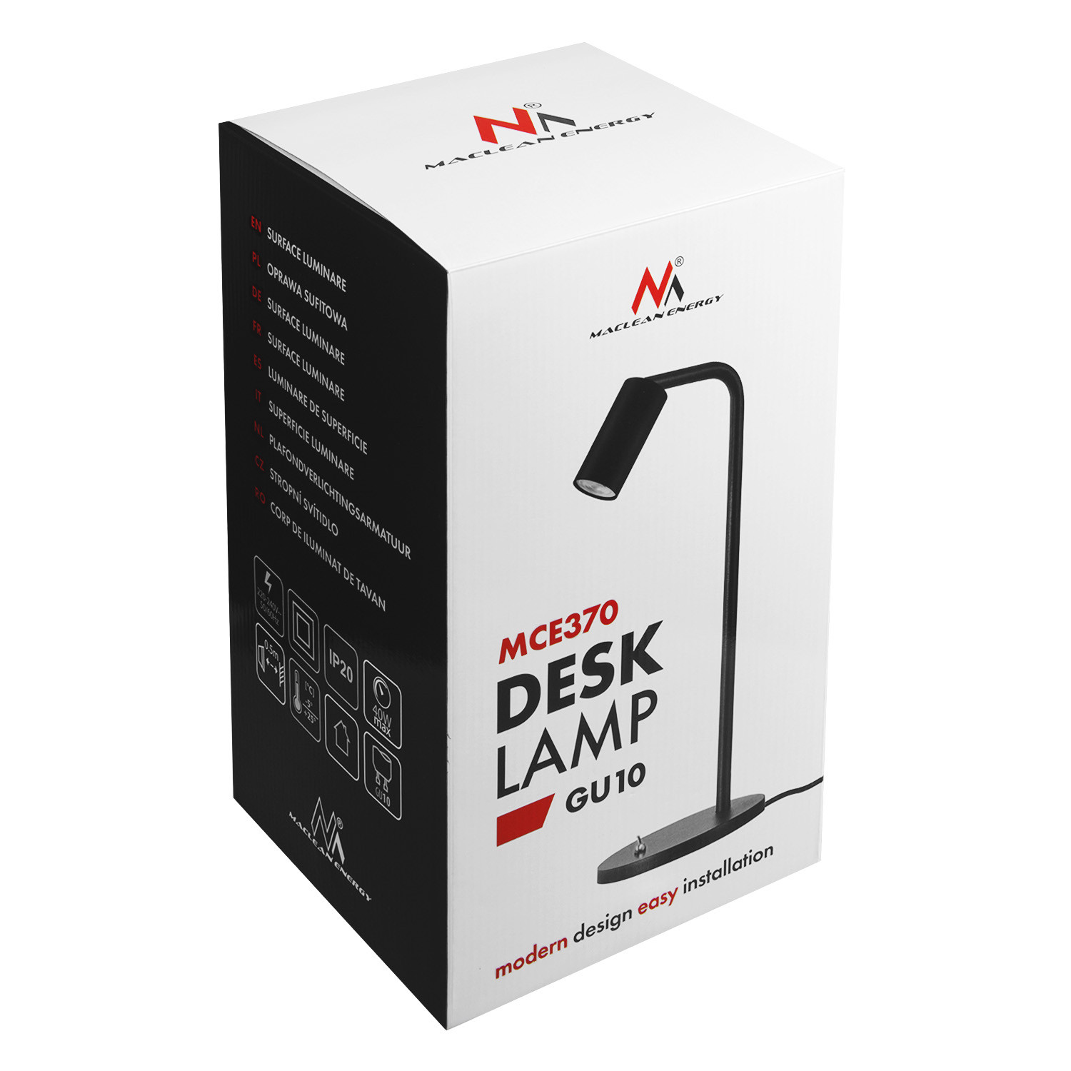 Lampka biurkowa Maclean MCE370 jest idealna do oświetlenia miejsc pracy, nauki czy czytania. Dzięki oprawce GU10, użytkownik ma możliwość dostosowania rodzaju i mocy żarówki do własnych potrzeb, co pozwala na stworzenie odpowiedniego klimatu w pomieszczeniu.