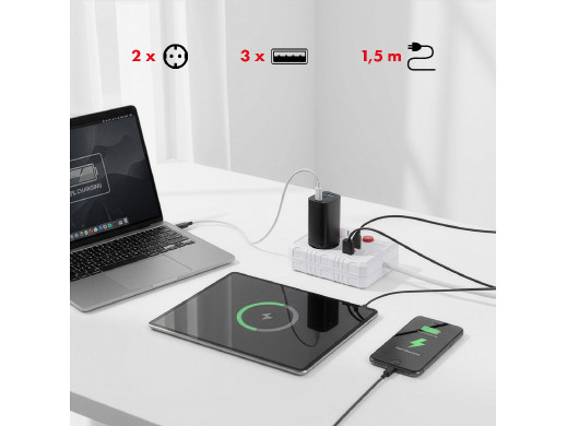Dwa gniazda sieciowe pozwalają zasilić najpotrzebniejsze urządzenia, takie jak laptop, monitor, lampka biurkowa czy głośniki, a trzy porty USB umożliwiają szybkie ładowanie sprzętów mobilnych bez dodatkowych adapterów. To idealne rozwiązanie do mniejszych przestrzeni, gdzie potrzebna jest funkcjonalność w kompaktowej formie.