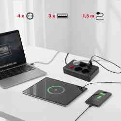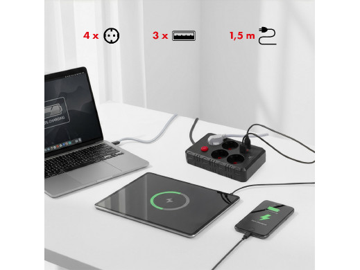 Dzięki czterem gniazdom sieciowym możesz komfortowo podłączyć kilka urządzeń jednocześnie, a trzy porty USB pozwalają ładować smartfony, tablety, słuchawki bezprzewodowe czy powerbanki bez konieczności używania dodatkowych zasilaczy. To ogromna wygoda, szczególnie w biurach, pokojach uczniów i domowych przestrzeniach multimedialnych.