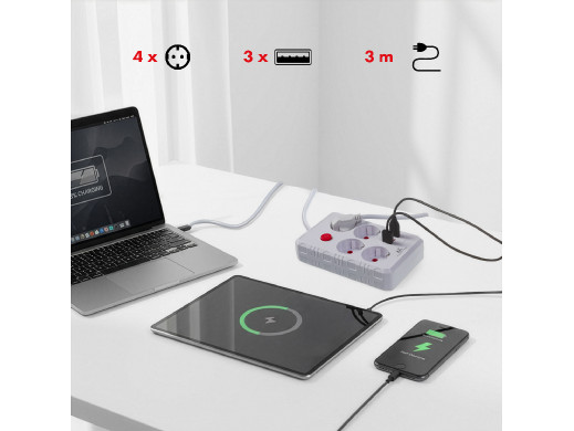 Dzięki czterem gniazdom sieciowym możesz komfortowo podłączyć kilka urządzeń jednocześnie, a trzy porty USB pozwalają ładować smartfony, tablety, słuchawki bezprzewodowe czy powerbanki bez konieczności używania dodatkowych zasilaczy. To ogromna wygoda, szczególnie w biurach, pokojach uczniów i domowych przestrzeniach multimedialnych.