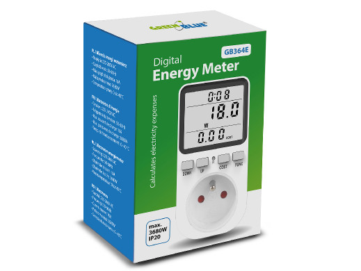 Miernik energii GreenBlue, watomierz, typ E, 220-240V AC, 50Hz, max. obciążenie 16A, IP20, wbudowana bateria, GB364 E