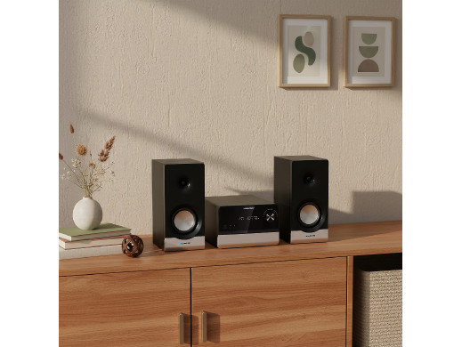 Mikrowieża MS40.2BT generuje 300 W mocy maksymalnej (2×150 W) i 100 W RMS (2×50 W), co w praktyce przekłada się na czysty, potężny i dynamiczny dźwięk, który bez trudu wypełnia całe pomieszczenie.