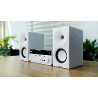 Złącze HDMI ARC, zlokalizowane na tylnej ściance obudowy, pozwala wprowadzić sygnał audio z każdego telewizora, który posiada złącze HDMI ARC i uzyskać znacznie bardziej dynamiczne brzmienie podczas oglądania filmów LUB seriali. Dzięki tej funkcjonalności możemy również sterować podstawowymi funkcjami mikrowieży za pomocą pilota od telewizora. Po połączeniu mikrowieży z TV, gdy włączymy telewizor – mikrowieża uruchomi się również w sposób automatyczny. Następnie możemy sterować poziomem głośności, wyciszyć dźwięk, a po zakończonym seansie wyłączyć jednym przyciskiem – zarówno telewizor, jak i mikrowieżę.