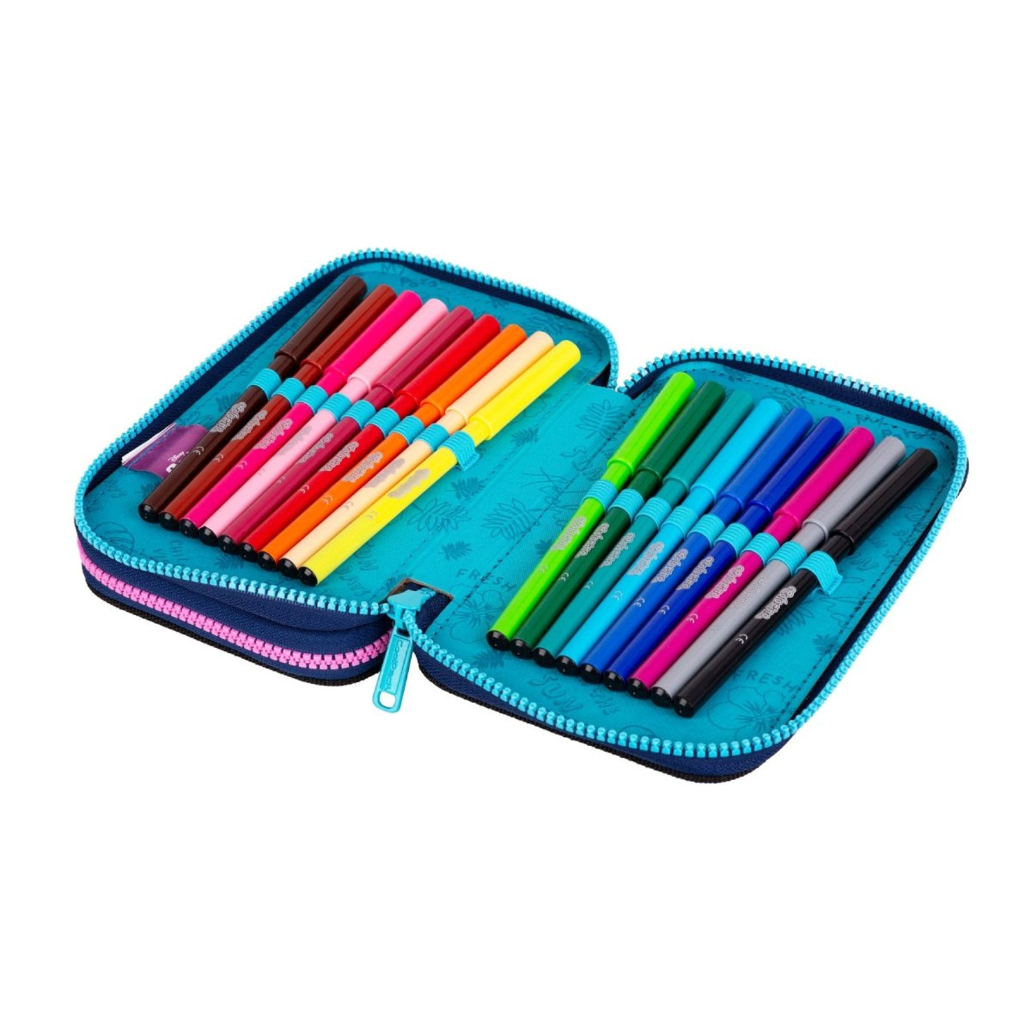 W pierwszej komorze znajduje się 12 kolorowych kredek, ołówek, długopis, linijka do 15 cm, temperówka i gumka do ścierania, a drugiej komorze umieszczono 18 kolorowych mazaków. Wszystko jest zatem pod ręką i nie musisz martwić się o zawartość szkolnego wyposażenia.