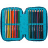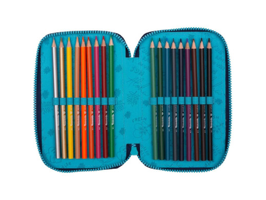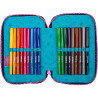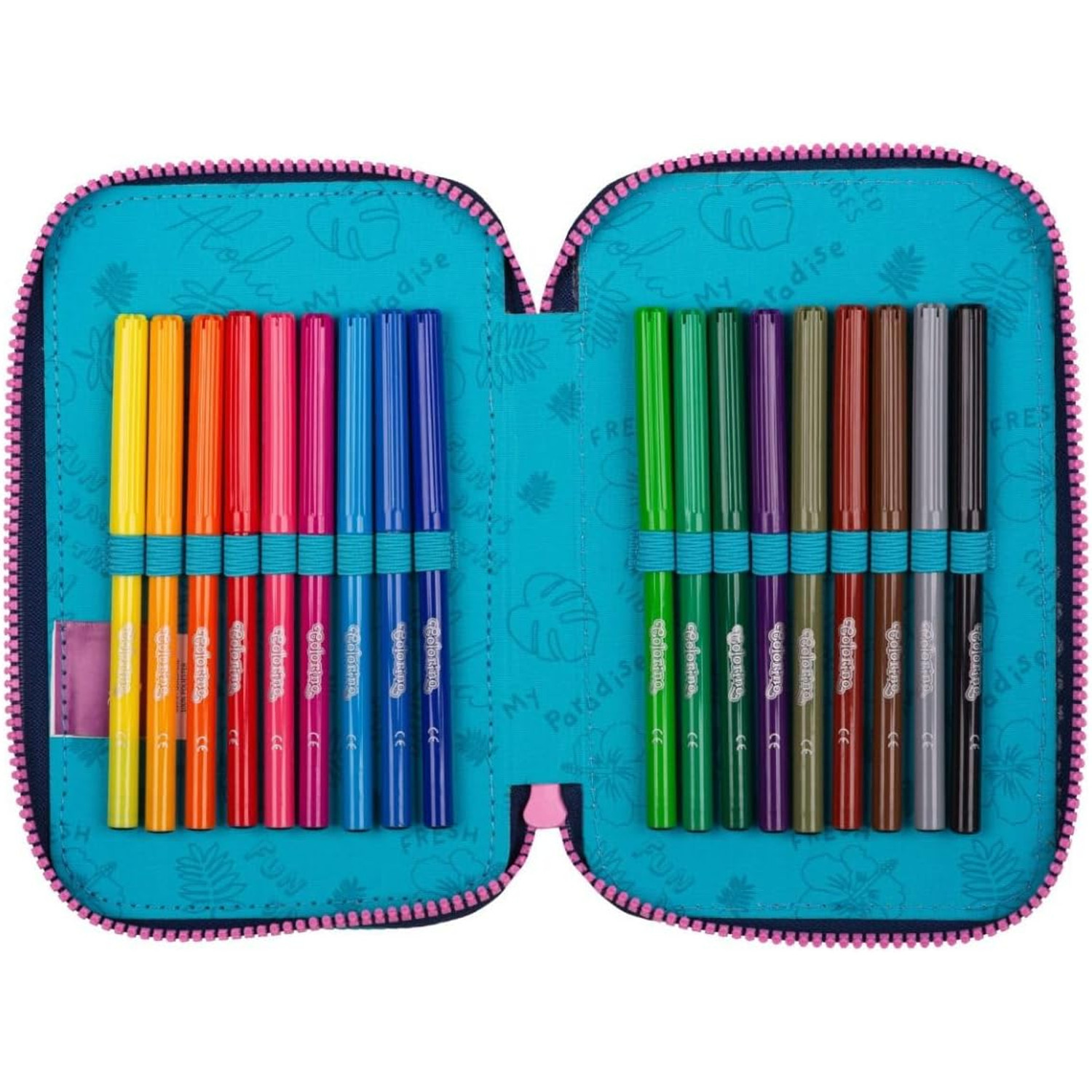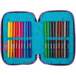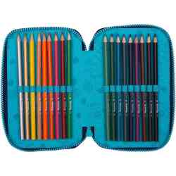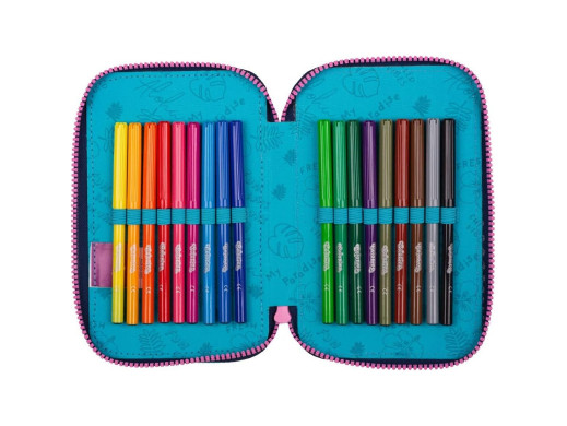 - W wyposażeniu piórnika znajduje się: 18 kolorowych kredek, 2 ołówki, 2 długopisy, linijka, ekierka, kątomierz, temperówka, gumka do ścierania, 18 flamastrów w różnych kolorach, nożyczki i miejsce na plan lekcji