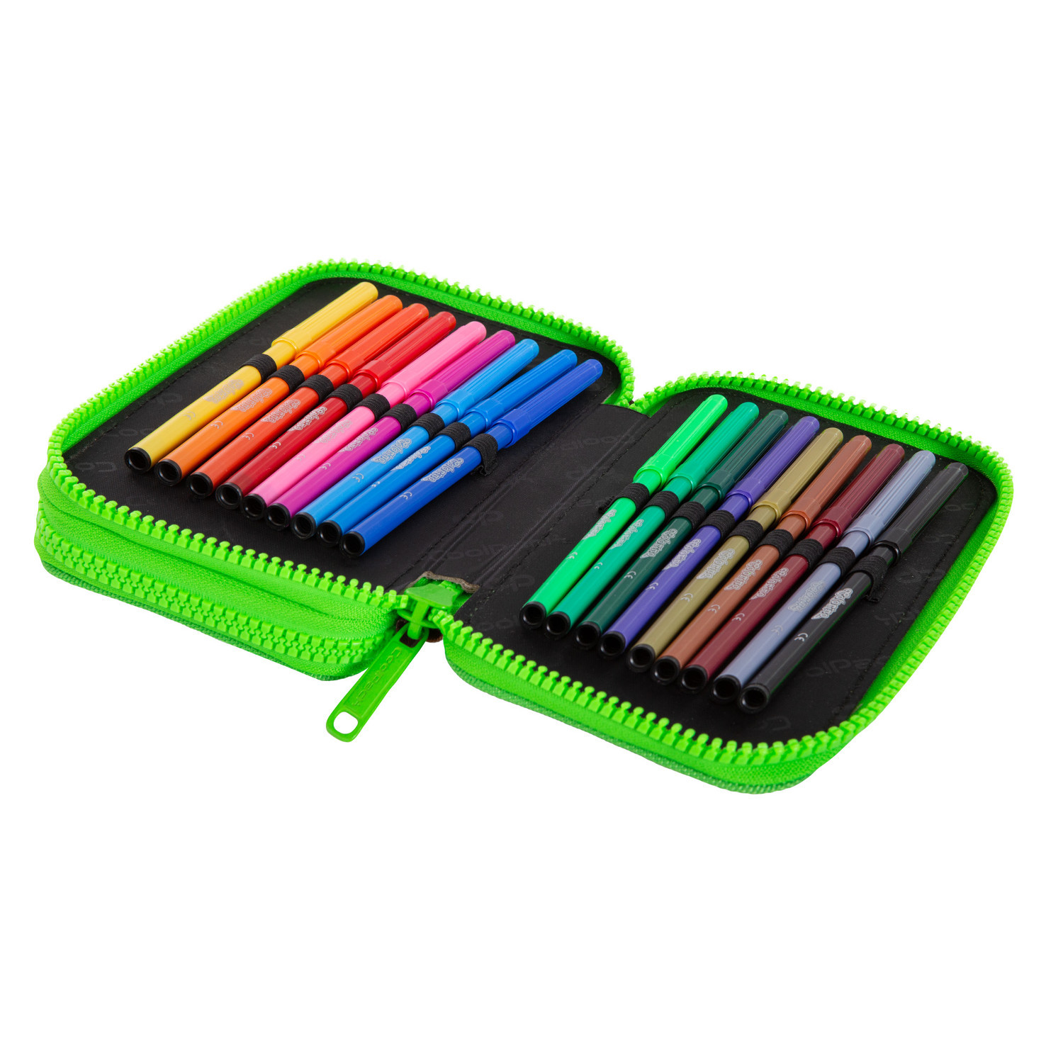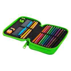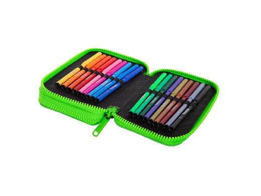 - W pierwszej komorze znajduje się 12 kolorowych kredek, ołówek, długopis, linijka do 15 cm, temperówka i gumka do ścierania, a drugiej komorze umieszczono 18 kolorowych mazaków. Wszystko jest zatem pod ręką i nie musisz martwić się o zawartość szkolnego wyposażenia