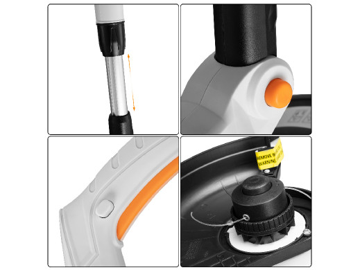 Podkaszarka elektryczna GGT41 marki PRIME3 posiada moc 500 W oraz średnicę koszenia 25 cm Urządzenie jest wyposażone w podwójną żyłkę o średnicy 1,0 mm, która jest wysuwana przez automatyczną głowicę. Specjalny nóż zamontowany na osłonie odcina nadmiar żyłki w trakcie obrotów. Model GGT41 posiada także specjalny ogranicznik do kwiatów, który zapobiega ich uszkodzeniu, jednocześnie gwarantując dokładne przycinanie. Precyzję podkaszania w każdej pozycji zapewnia funkcja regulacji kąta głowicy.