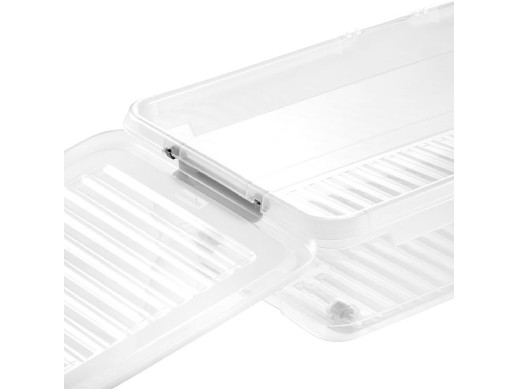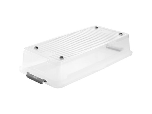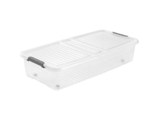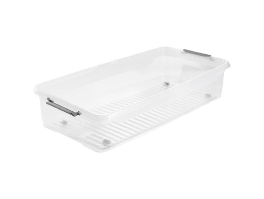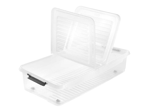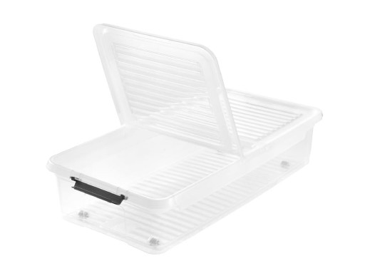 Pojemnik wyposażony jest w pokrywę otwieraną z obu stron, co zapewnia szybki i wygodny dostęp do zawartości. Uniesioną pokrywę można zablokować w jednej pozycji, co ułatwia wkładanie i wyjmowanie przechowywanych rzeczy. Solidne klipsy gwarantują bezpieczne zamknięcie, chroniąc zawartość przed kurzem i zabrudzeniami. Skrętne kółka obracane o 90° umożliwiają łatwe przesuwanie pojemnika oraz swobodne wsuwanie go pod łóżko lub kanapę. Pojemność 33 litry sprawia, że pojemnik pod łóżko Leo łączy kompaktowe wymiary z dużą funkcjonalnością.