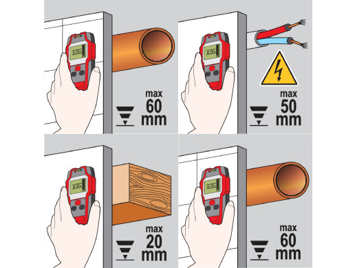 - Rodzaj wykrywanych przedmiotów: drewno, metal, przewody pod napięciem (A.C.)