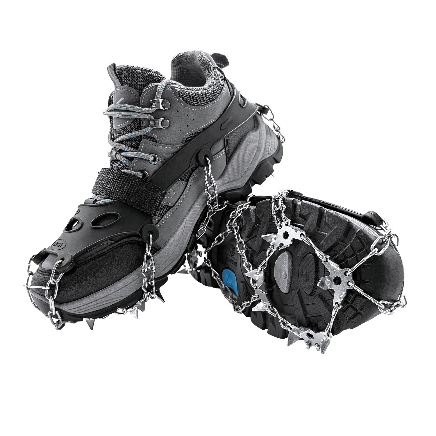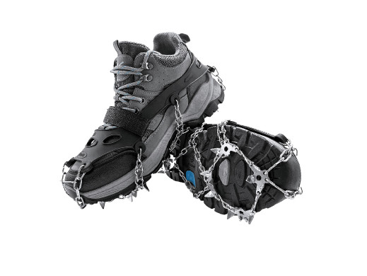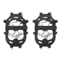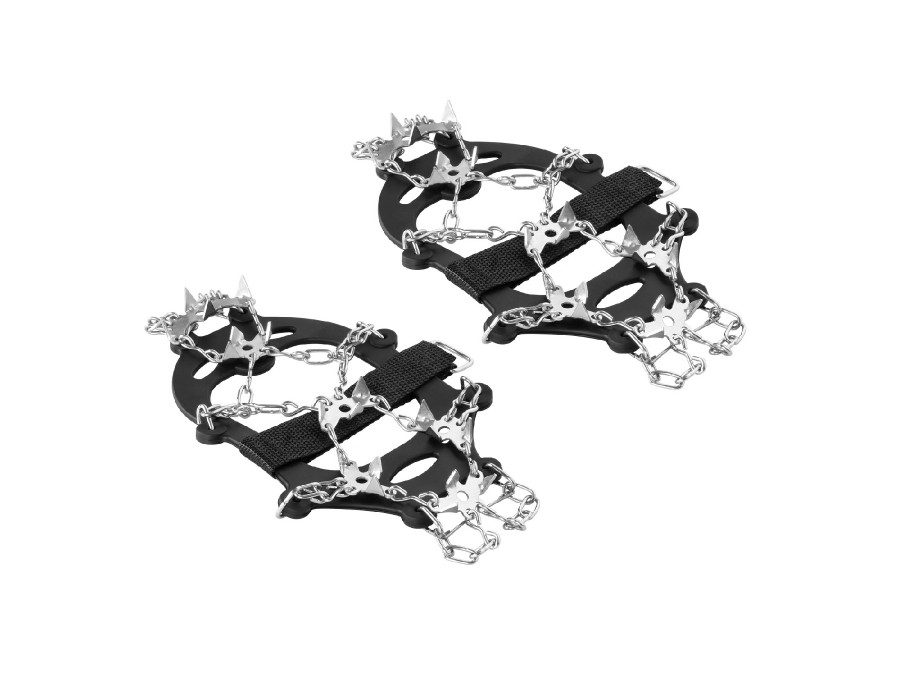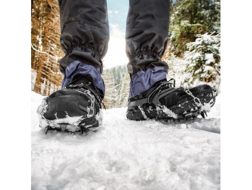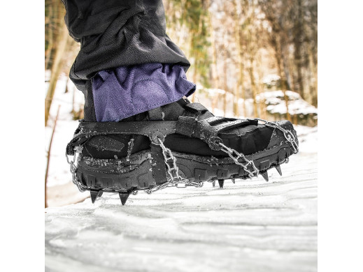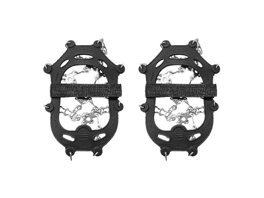 Raczki wyposażone są w 19 stalowych kolców o wysokości 14 mm, co zapewnia doskonałą przyczepność na śliskich powierzchniach. Kolce oraz łańcuchy wykonane są ze stali nierdzewnej, co gwarantuje ich odporność na korozję i trwałość. Silikonowa obejma jest elastyczna i dopasowuje się do różnych rozmiarów butów, zapewniając stabilność i komfort noszenia.