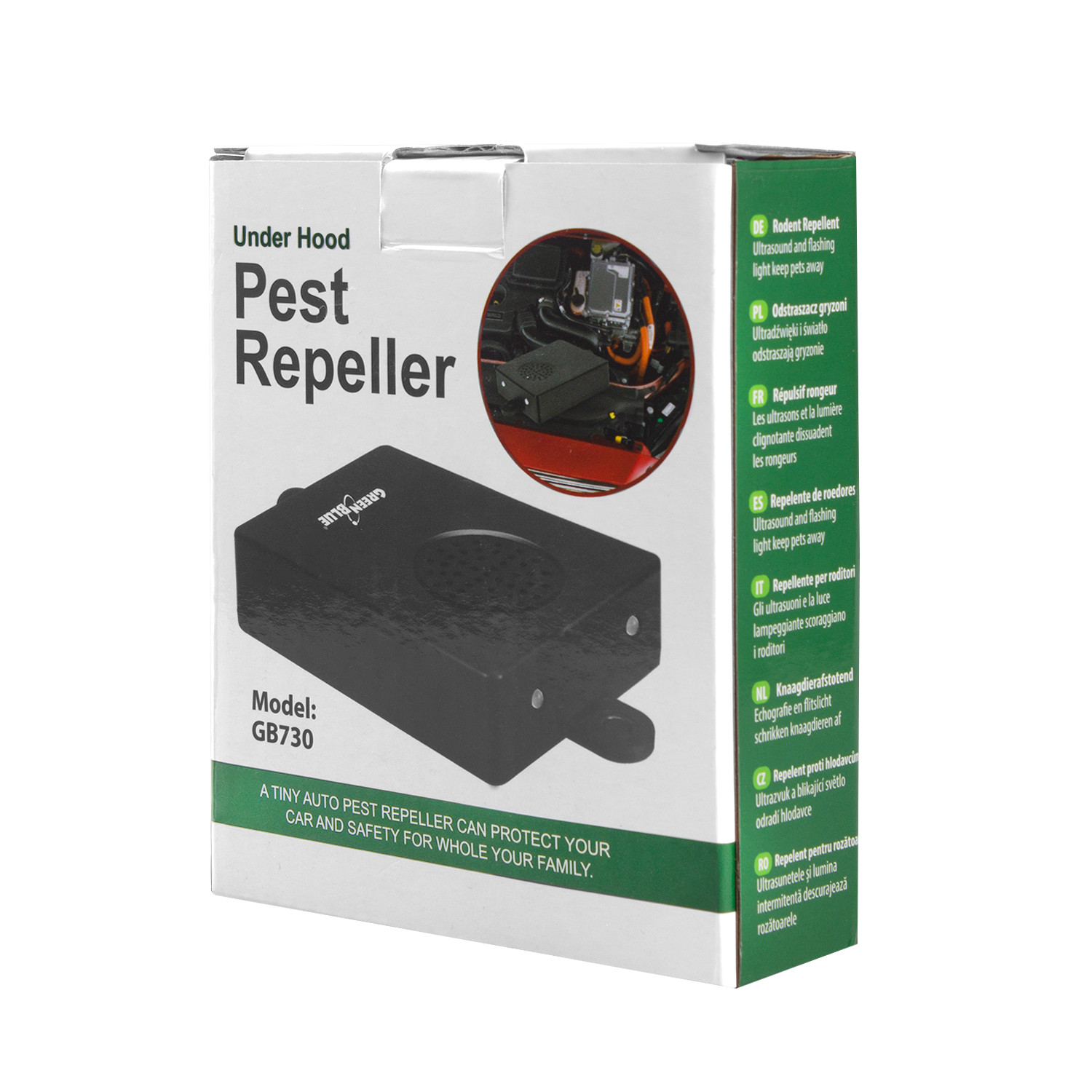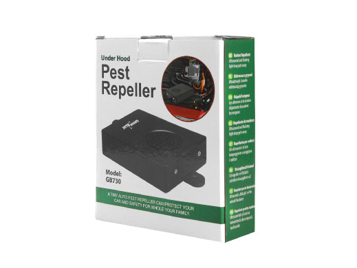 Samochodowy odstraszacz gryzoni GreenBlue GB730 to urządzenie, które skutecznie zapobiega przedostawaniu się szkodników pod maskę samochodu. Emituje ultradźwięki, które są niesłyszalne dla ludzi, ale skutecznie odstraszają kuny, łasice, szczury i myszy. Urządzenie jest proste w montażu i posiada oszczędny układ zasilania.