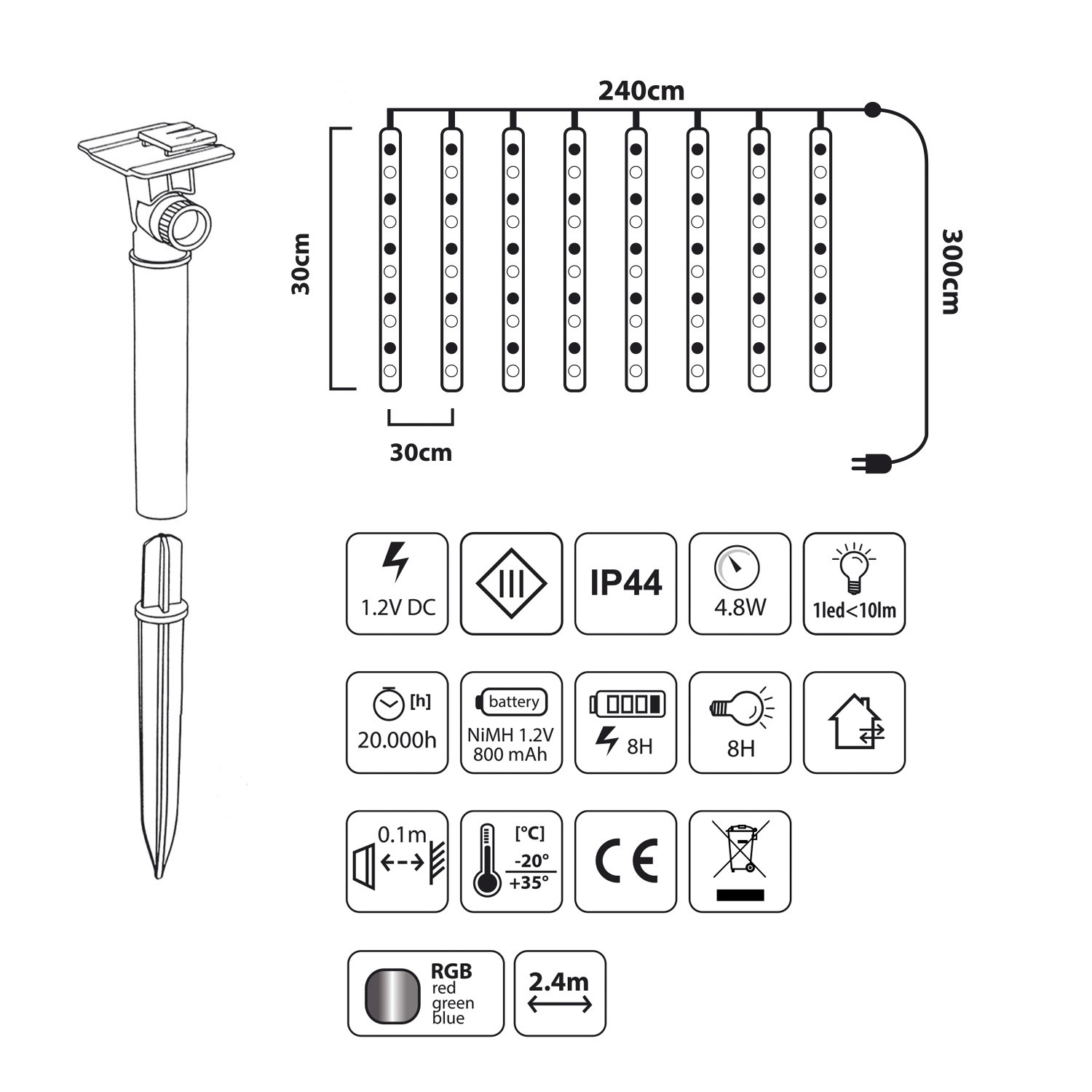 Lampki składają się z 8 segmentów w formie sopli o długości 30 cm. Na lampkach znajdują się 144 diody LED świecące w kolorach: niebieskim, czerwonym i zielonym.