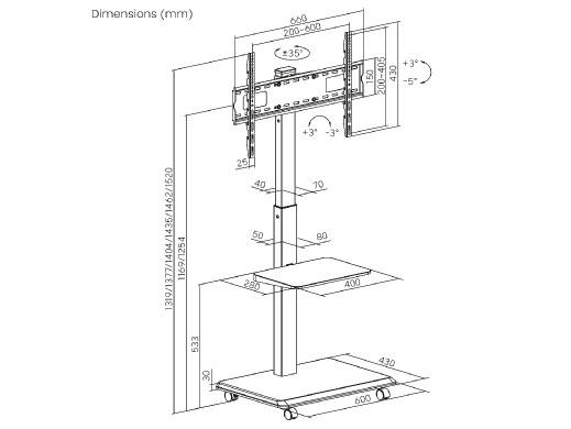 Stand / wózek dla TV Ergo-Office, max. obciążenie 50kg / 5kg półka, max. VESA 600x400, wbud. listwa zasil., czarny, ER-304 B