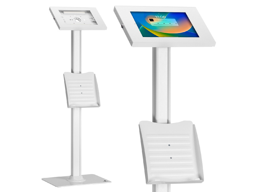 Maclean MC-476 to podłogowy stojak/stand/iKiosk na tablet, cechujący się wysoką jakością wykonania oraz solidną stalową podstawą z otworami montażowymi, zapewniającymi maksymalny poziom bezpieczeństwa dla umieszczonego w środku urządzenia. Prezentowana obudowa została odpowiednio przystosowana do montażu na poziomych powierzchniach. Tablet można ustawić w poziomie lub pionie.