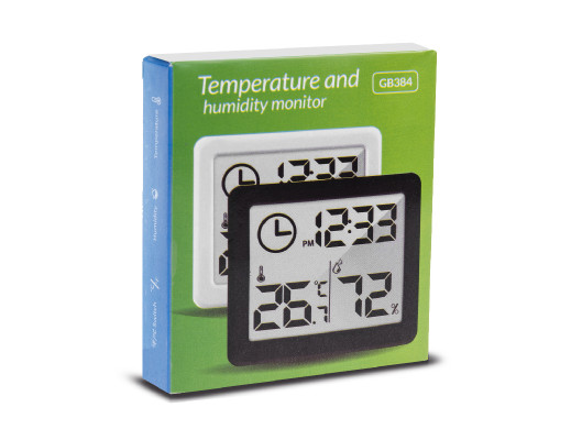 Zestaw zawiera- Termometr/higrometr z funkcją zegara GreenBlue GB384W