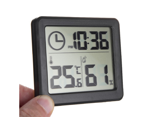 Czytelny ekran wyświetla jednocześnie temperaturę, wilgotność oraz godzinę.