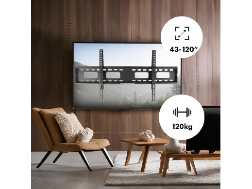 Uniwersalny uchwyt ścienny służy do montażu telewizorów LCD, LED, OLED różnych marek o wadze do 120 kg i przekątnej ekranu od 43” do 120”.