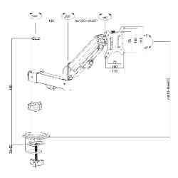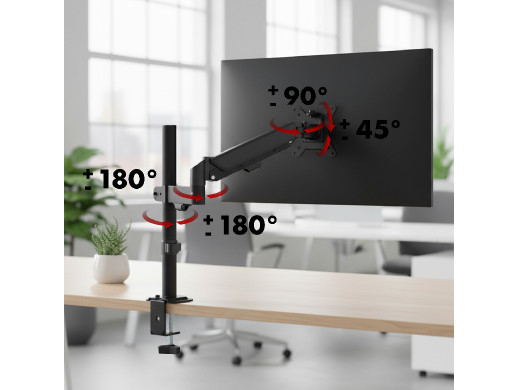 Regulowany uchwyt MC-135 umożliwia pełną kontrolę nad pozycją monitora, oferując szeroki zakres ruchu w każdej płaszczyźnie. Konstrukcja pozwala nie tylko na płynną regulację wysokości ekranu za pomocą sprężyny gazowej, ale także na zmianę wysokości montażu ramienia na słupku, co umożliwia dopasowanie położenia monitora już na etapie instalacji. Kąt nachylenia ekranu można dostosować w zakresie od -45° do +45°, co pozwala uniknąć odblasków i precyzyjnie dopasować kąt widzenia. Dodatkowo, ekran można obracać na boki w zakresie ±90°, co ułatwia ustawienie monitora względem użytkownika i otoczenia. Obrót ramienia w przegubie oraz przy słupku – po 180° – zapewnia jeszcze większą elastyczność i swobodę ustawienia. Dzięki temu możesz dowolnie przesuwać, obracać i pochylać monitor, a także dopasować jego wysokość do własnych preferencji, tworząc idealnie ergonomiczne stanowisko pracy.