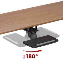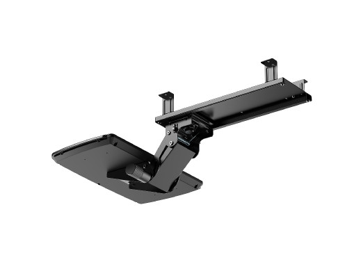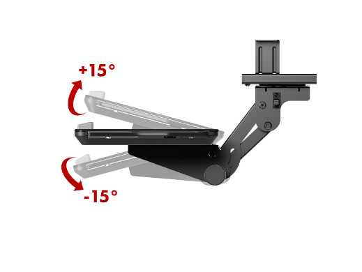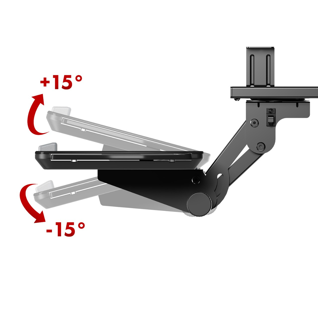 Uchwyt pozwala także na regulację nachylenia klawiatury w zakresie do 15 stopni, co umożliwia idealne dopasowanie kąta pracy do indywidualnych potrzeb użytkownika, zmniejszając tym samym napięcie w nadgarstkach i przedramionach.