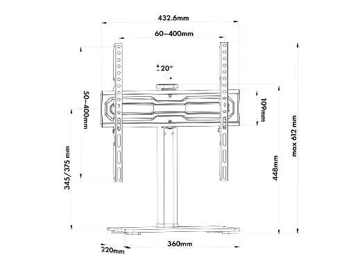 - VESA: 75x75, 100x100, 100x150, 150x100, 100x200, 200x100, 150x150, 200x200, 300x200, 400x200, 300x300, 400x300, 400x400 mm