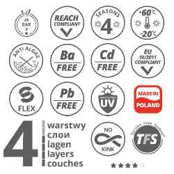 Nie skręca się podczas użytkowania. Wewnętrzna warstwa węża wyprodukowana została z surowców przeznaczonych do kontaktu z żywnością.