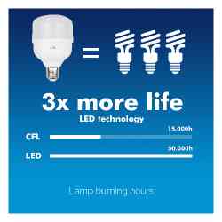 Długa żywotność dochodząca do 20000 godzin kilkakrotnie przewyższa żywotność standardowej żarówki wolframowej lub kompaktowej lampy fluorescencyjnej.