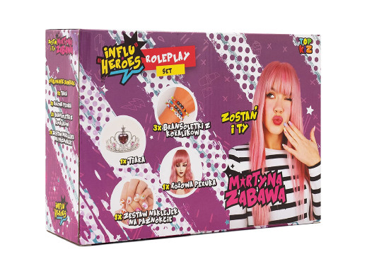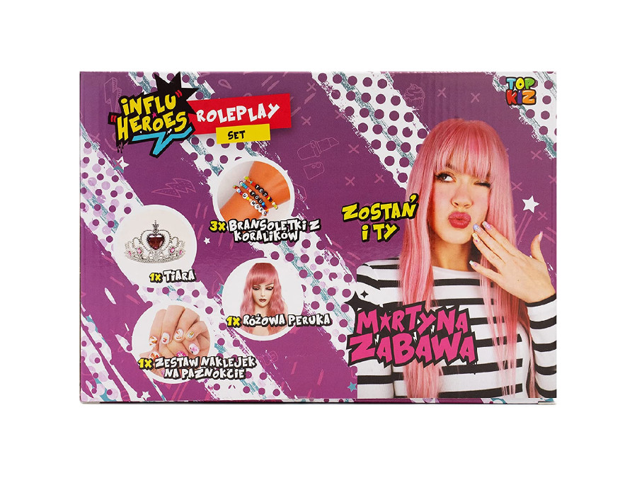 Martyna Zabawa wybrała najlepsze i najbardziej charakterystyczne akcesoria, dzięki którym każde dziecko będzie mogło wcielić się w rolę tej popularnej i lubianej YouTuberki. W zestawie znajduje się tiara, różowa peruka, kolorowe naklejki na paznokcie i aż trzy bransoletki z koralików!